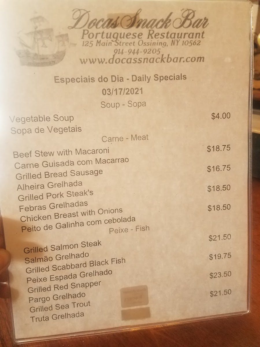 At Docas Menu, you'll find a delightful mix of dishes that bring a burst of flavor right to your table. Nestled at 125 Main St Suite 1 in Ossining, NY, this place invites you to enjoy comfort food with a twist. From savory appetizers to mouthwatering mains, each dish is crafted with fresh ingredients that cater to every taste. Whether you're in the mood for something hearty or light, the menu has something that will satisfy your cravings. With a friendly vibe and flavors that pack a punch, dining here is always a good idea. Whether you're grabbing a quick bite or enjoying a leisurely meal, every dish on the menu promises to deliver an unforgettable experience.
